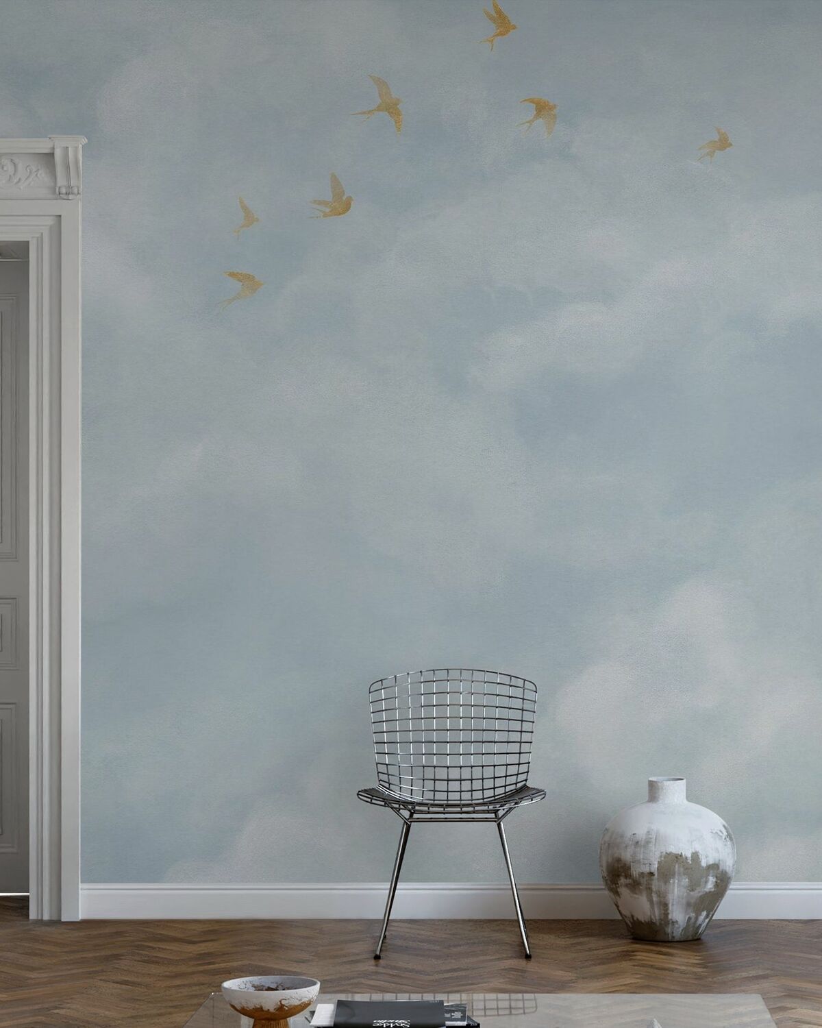 Fototapet Nori delicați cu rândunele galbene – Albastru moale